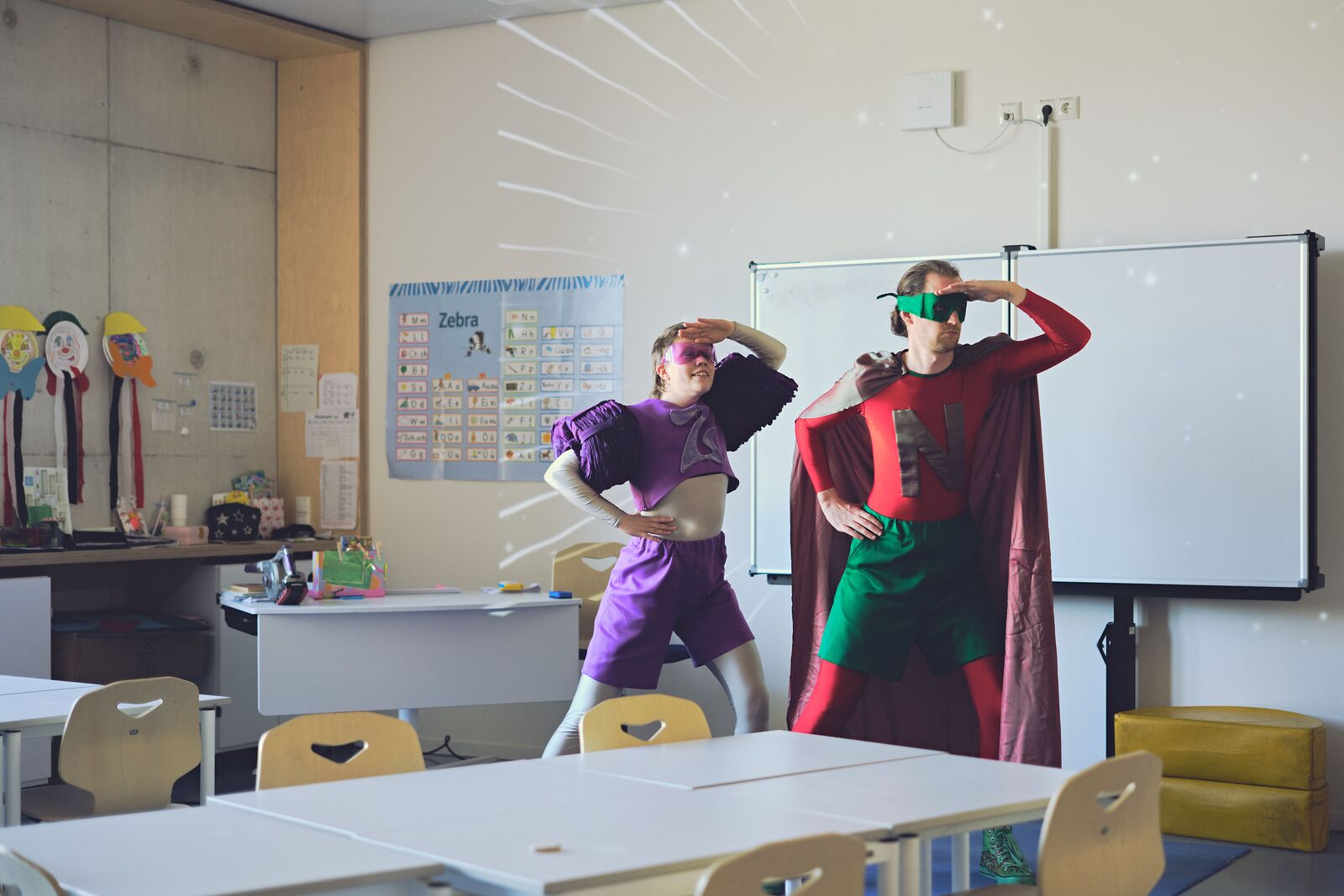 Ein waghalsiger Auftrag, übermenschliche Kräfte und sofort erkennbare, aber ausgefallene Kostüme – das sind die Zutaten für unsere S.U.P.E.R.-Held*innen-Mission im Klassenzimmer, die alles bisherige in den Schatten stellt. Im Zentrum steht der drohende Verlust einer besonderen Kraft: des Tagträumens. Kann dieser Schaden durch unsere Held*innen abgewendet werden? Vielleicht mit Hilfe von Euch aus dem Unterrichtsraum? Lara Kaiser, die fantastischen Zwei und die Drama Control entwickeln einen Theater-S.U.P.E.R.-Auftrag mit vielen sinnlichen Momenten.