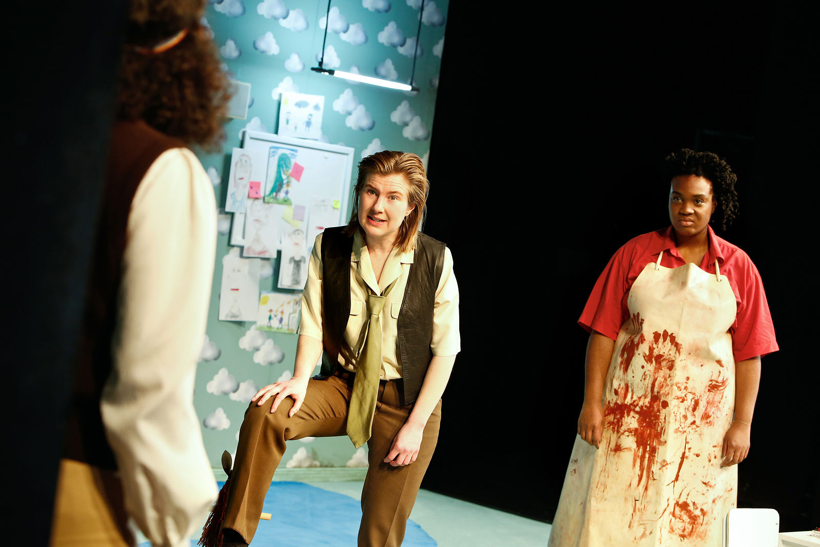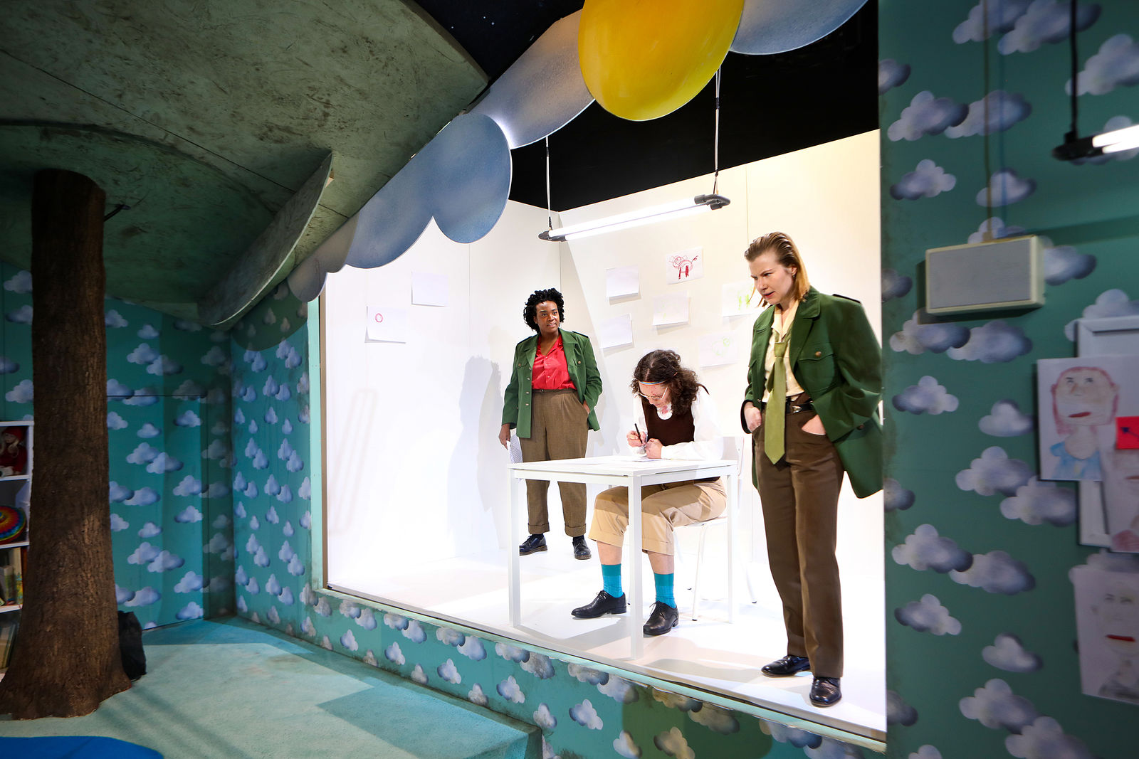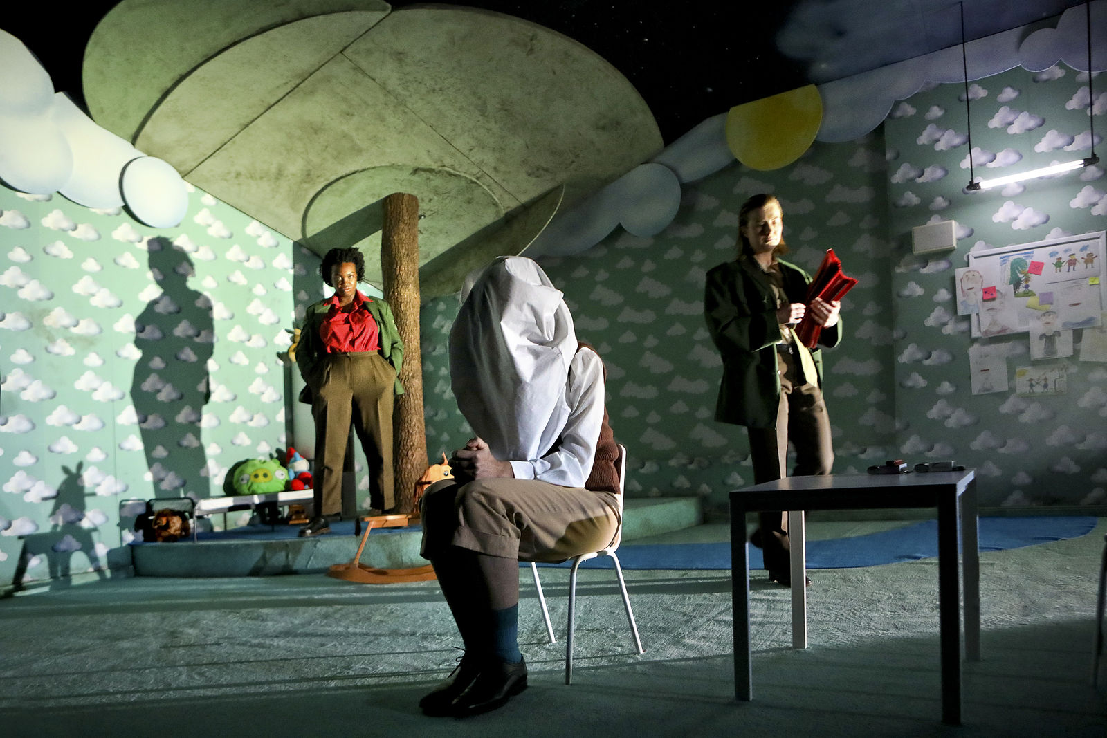 On closer inspection, numerous pitfalls emerge that transform this criminal case into a masterful play of fact and fiction. The two brothers are linked by a dark family secret that involves real violence and literary empowerment. And the two policemen whose inclination towards self-revelation can at times be impressive, display traumatic wounds of their own. What’s more, the brothers and the detectives find themselves in a totalitarian state where suspicion is seen as proof, statements under torture as legitimate confessions and, instead of an orderly trial, swift execution awaits. However, the screams of pain from Katurian’s brother – apparently being mistreated next door – turn out to be fabricated, the blood on the policemen’s hands unreal, the body parts fake and the missing girl very much alive. What and who can we believe here?